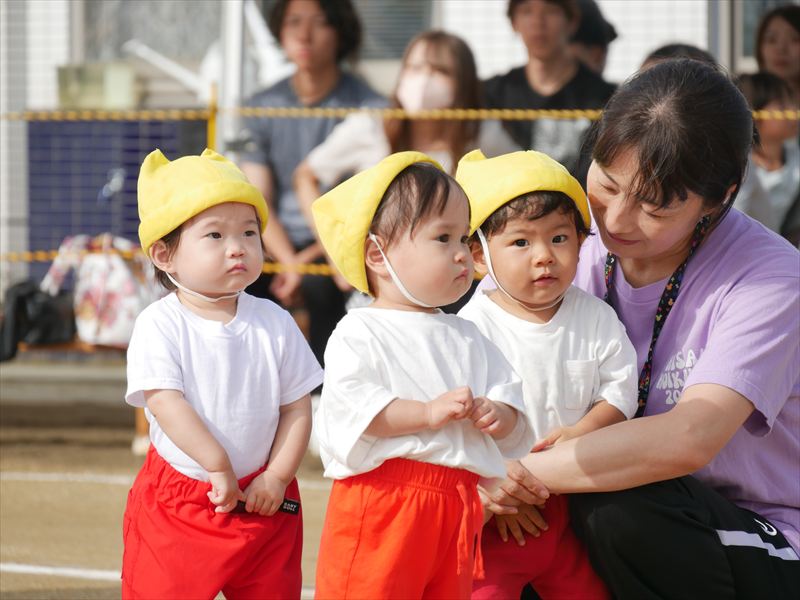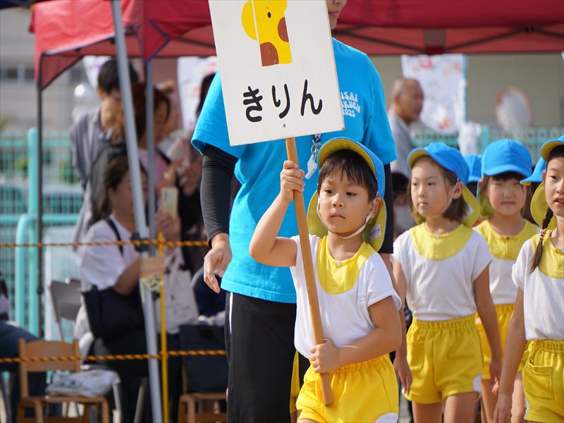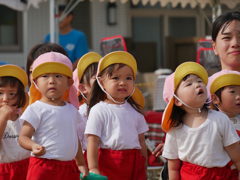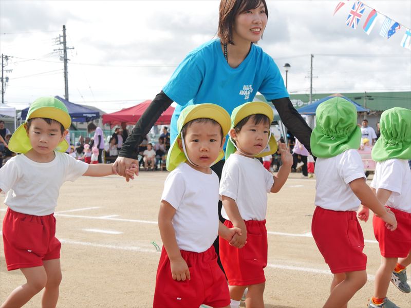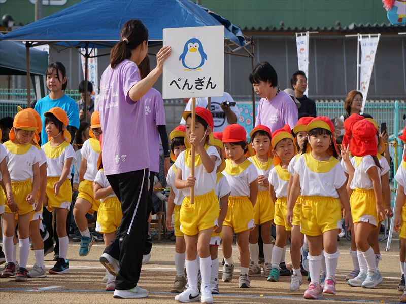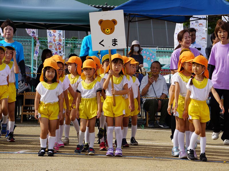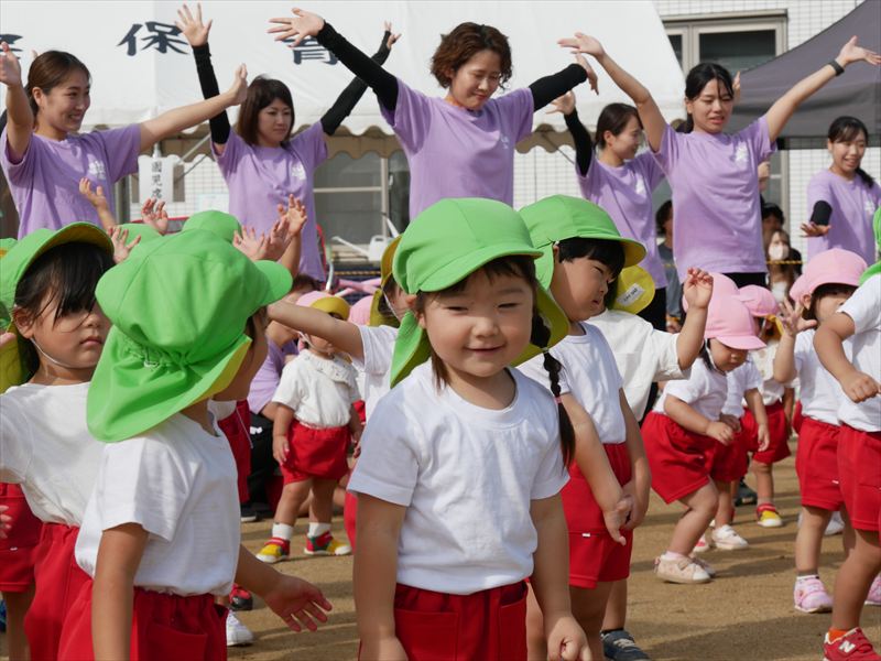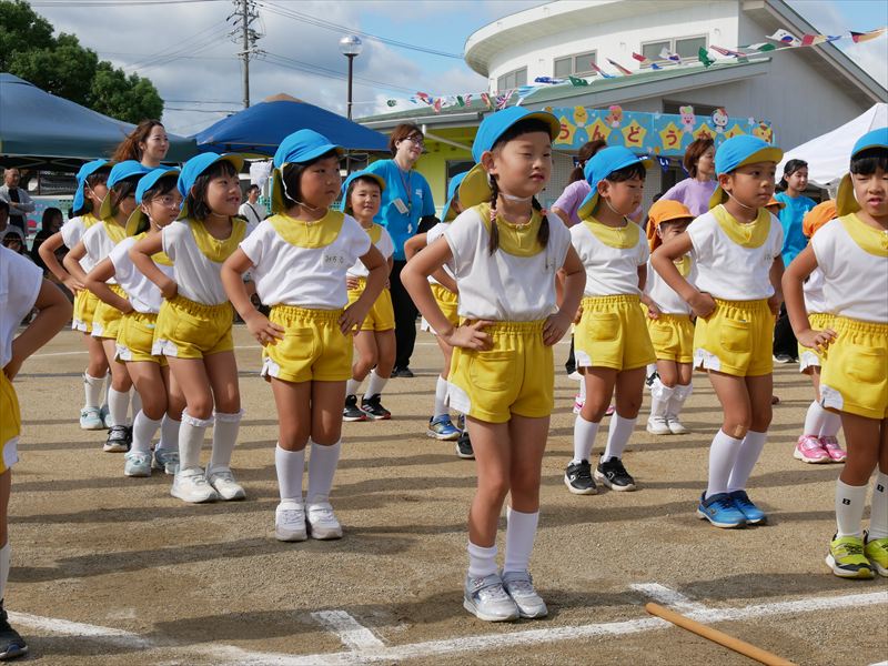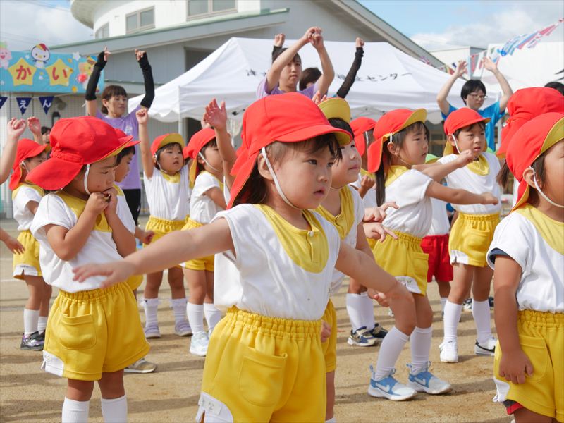 開会式の後、プログラム1番は、全園児によるキッズ体操「きみもとべるよ」です。みんな元気いっぱい体操できました。