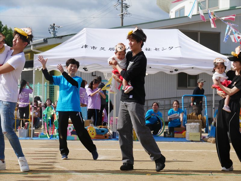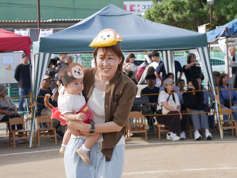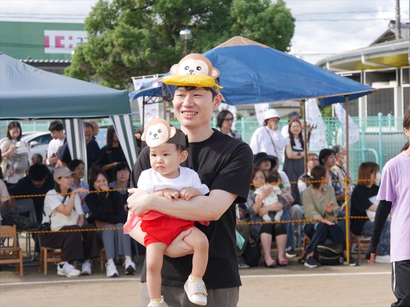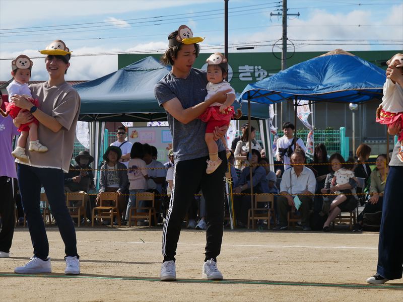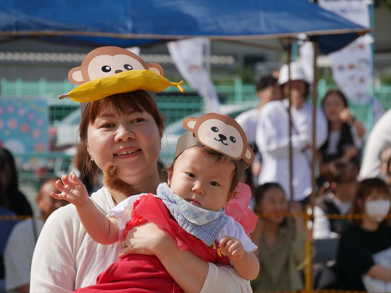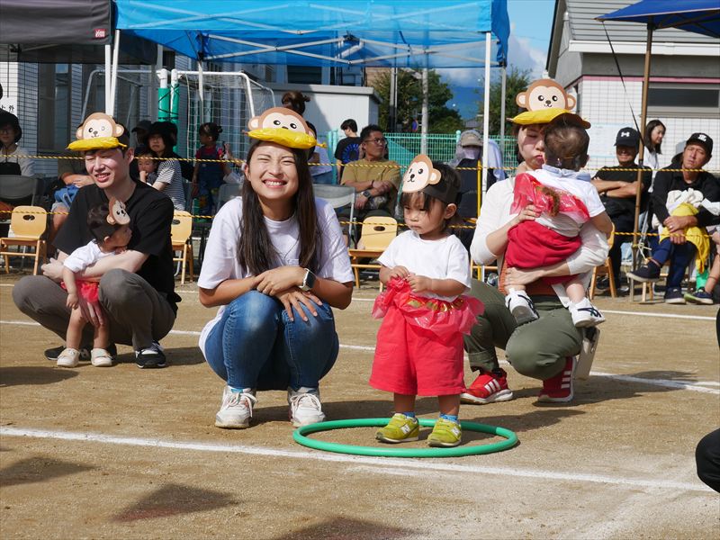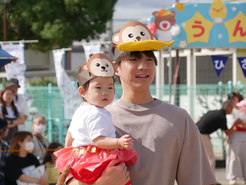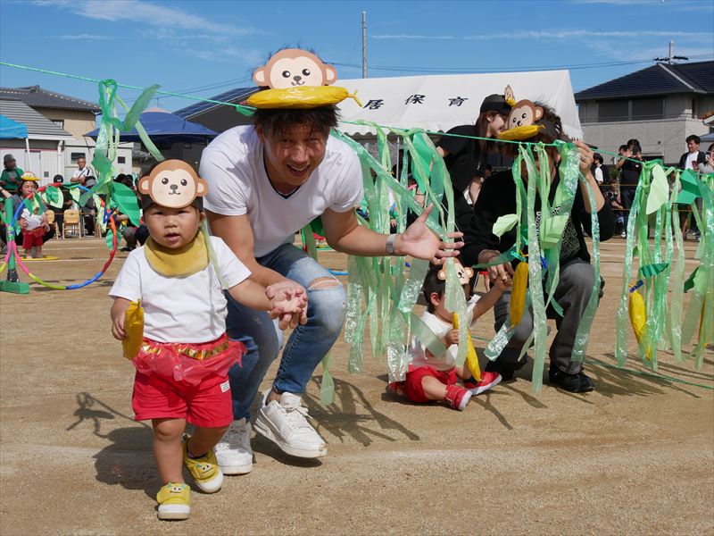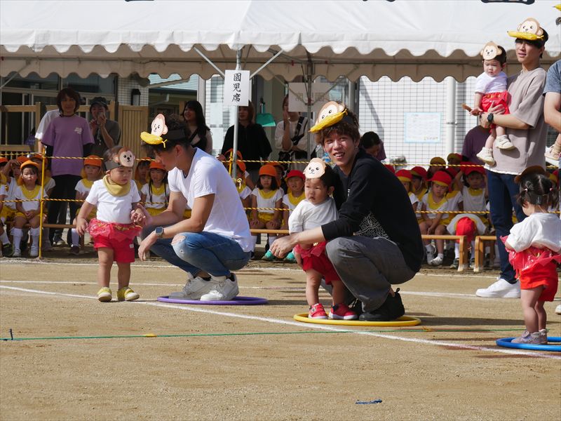 ひよこ組さんにとって初めての運動会です。今日はかわいいおさるさんに変身して、お家の人と元気に踊りました。