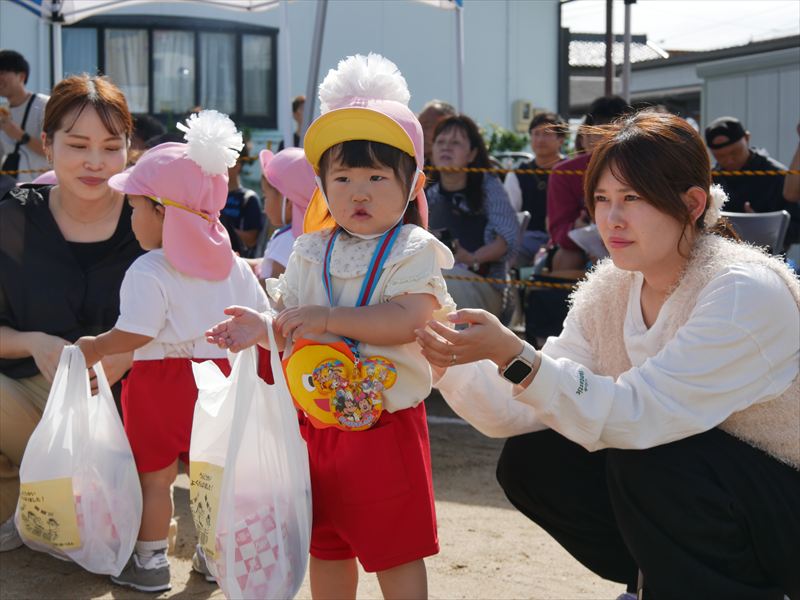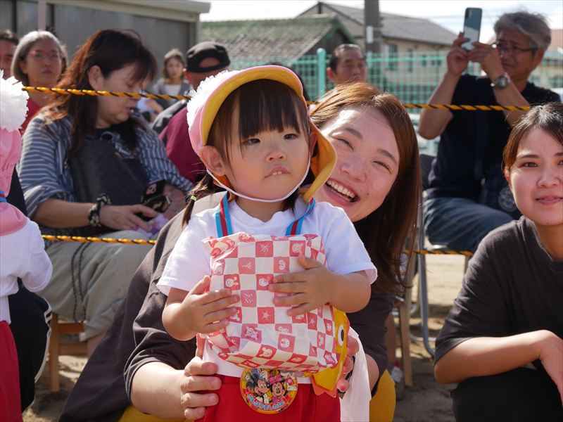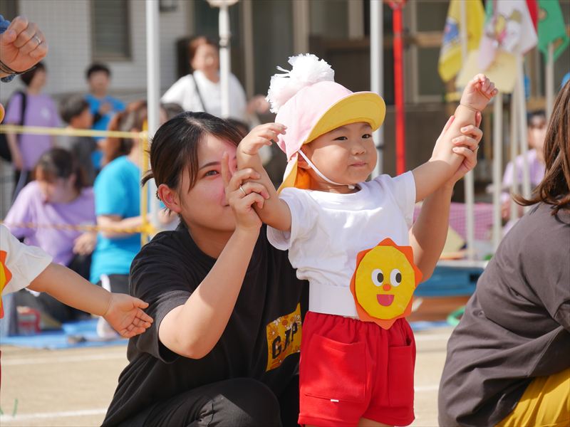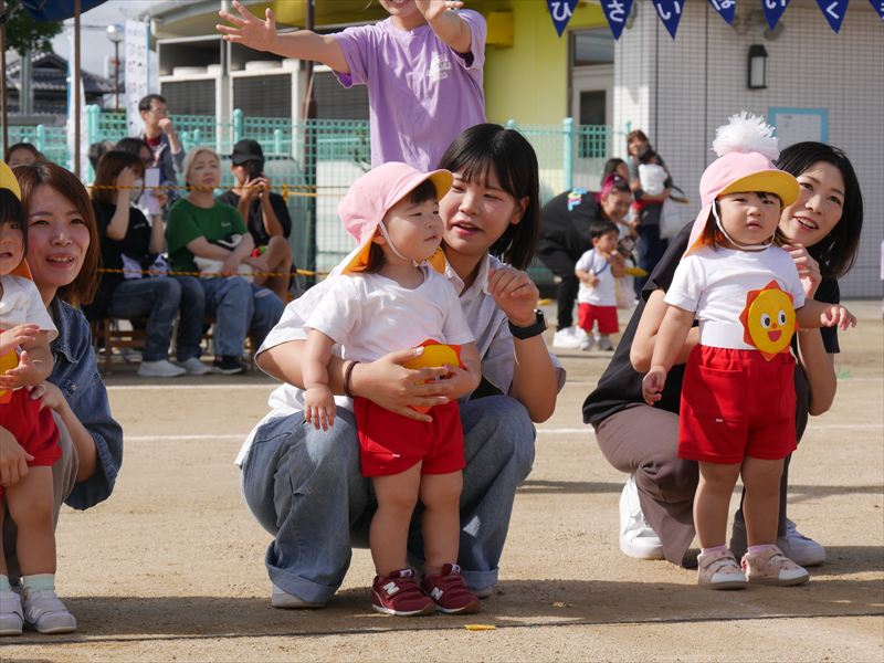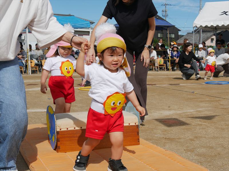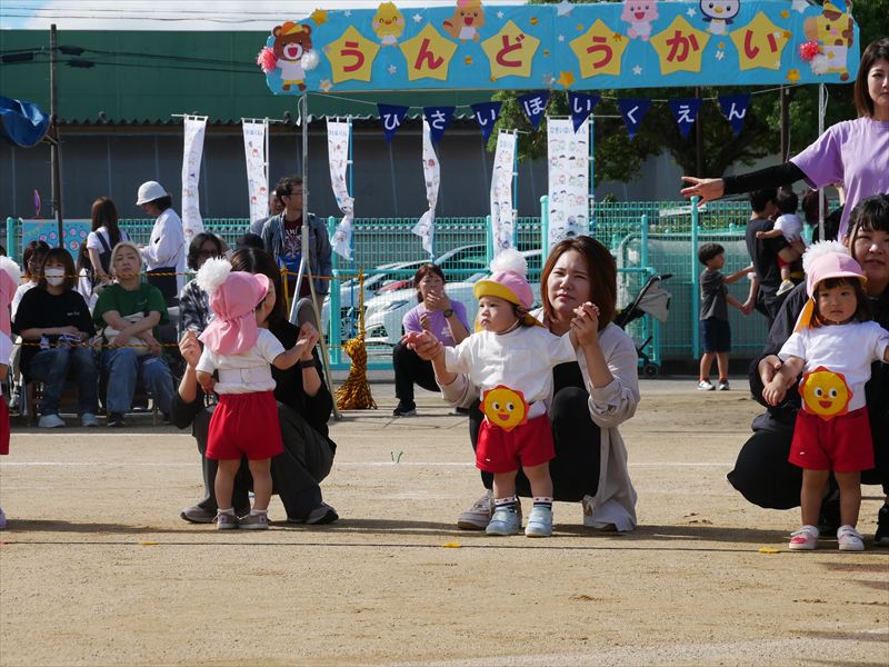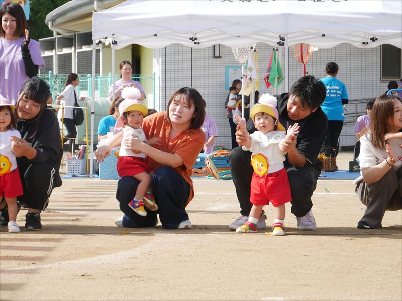 にこにこ笑顔がかわいいりす組さん。今日はにこにこお日様をつけて登場し、お家の人と楽しく踊りましたね。
