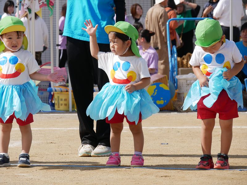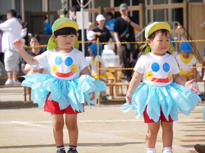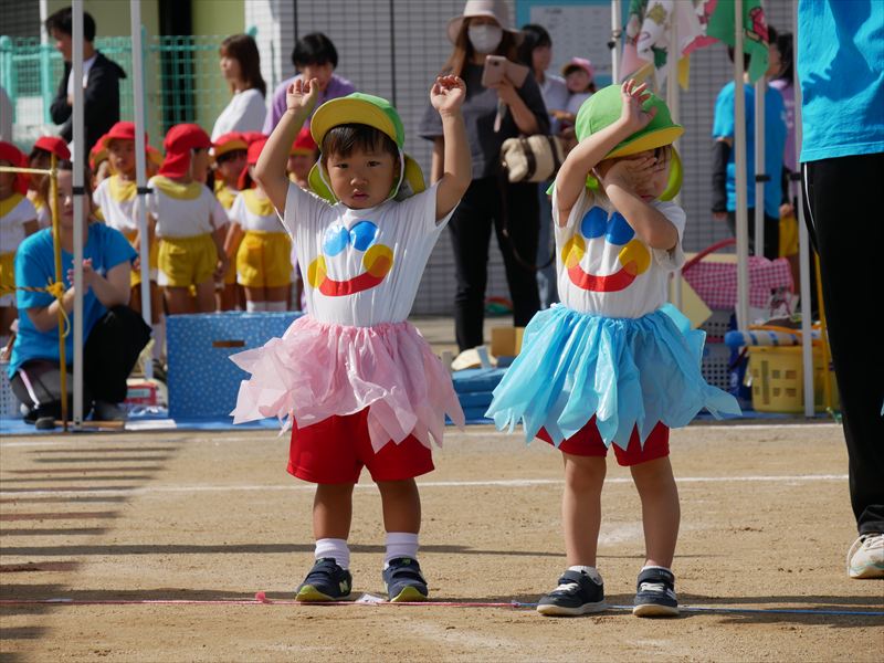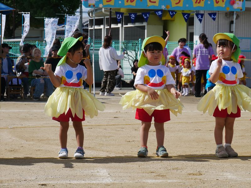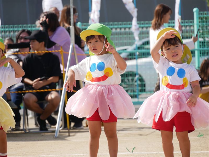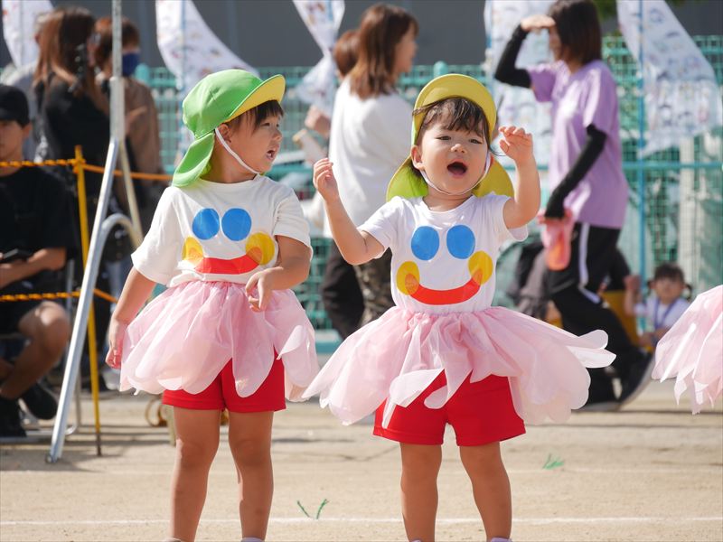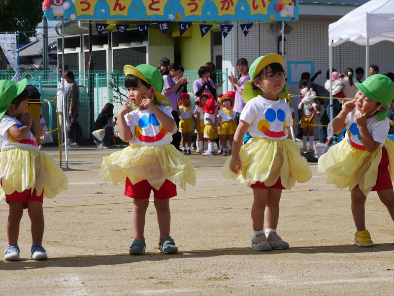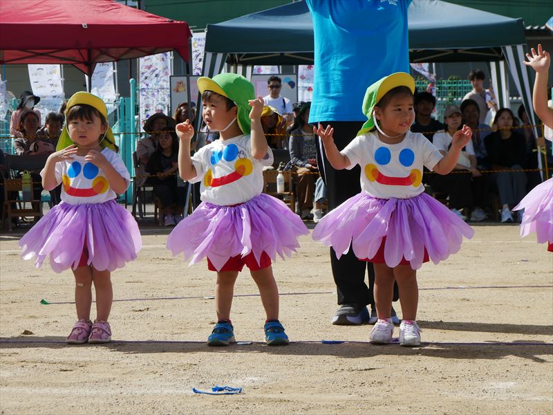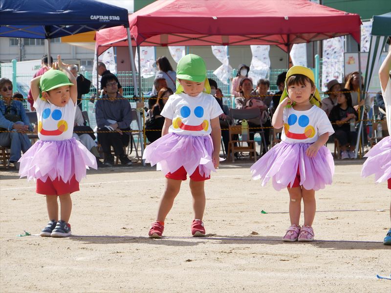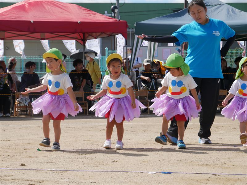 今年もとてもかわいい動きのダンスを踊ります。曲中に隊形移動もあります。子ども達の表情は様々ですが、それもいいね!!