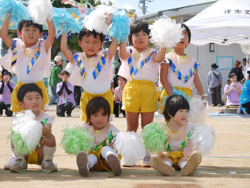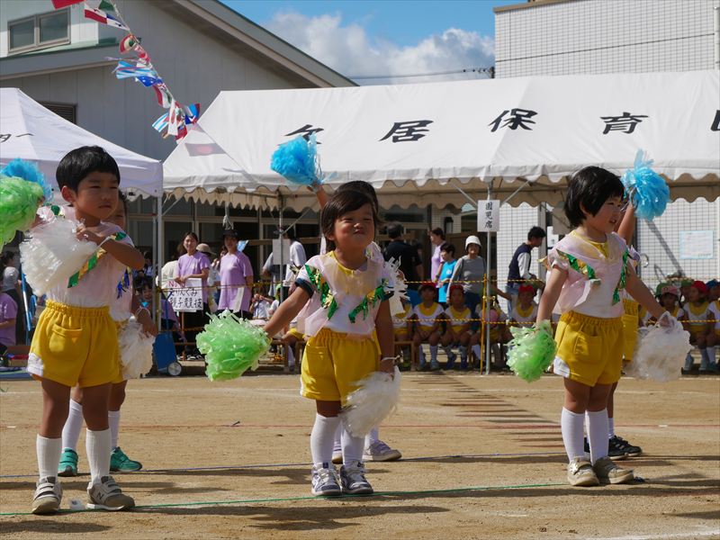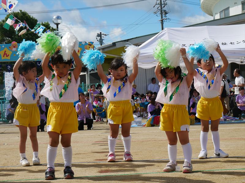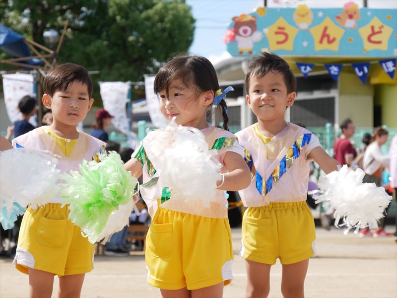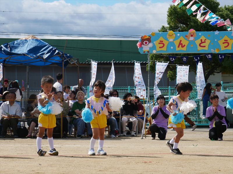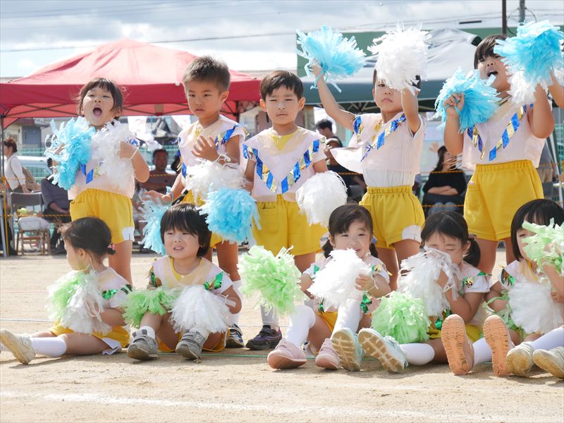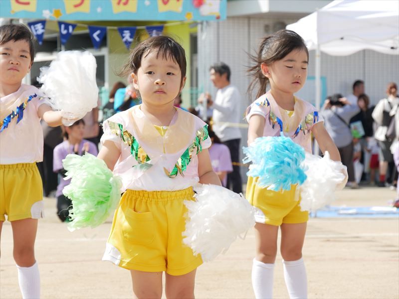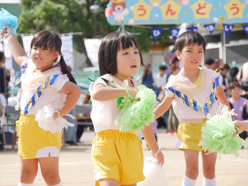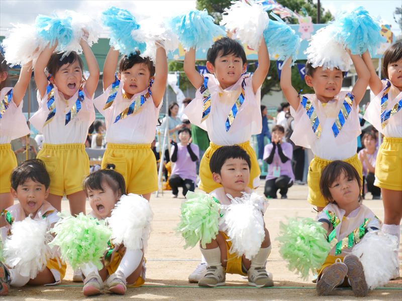 両手にポンポンを持ち、手を上げたり、おしりをいっぱいフリフリしたり、元気な掛け声で踊ることができましたね。とても格好いい姿を見せてくれました。