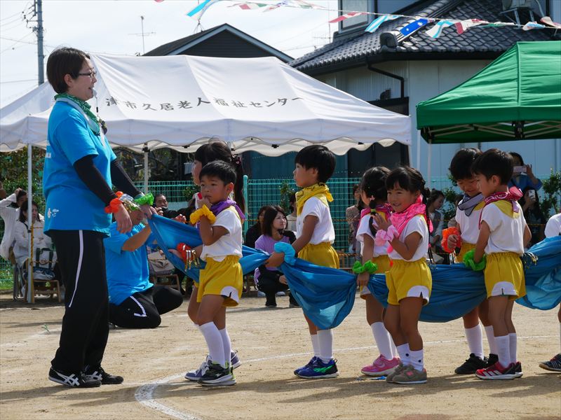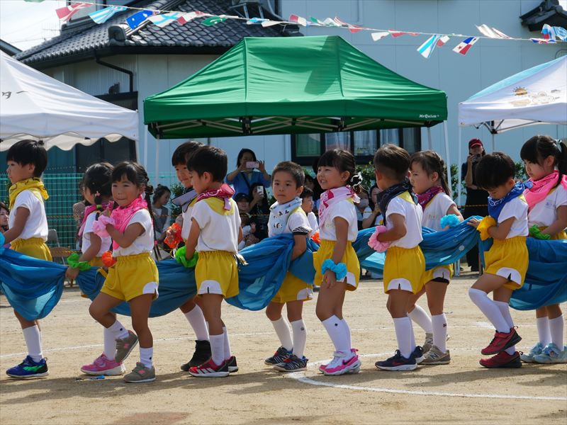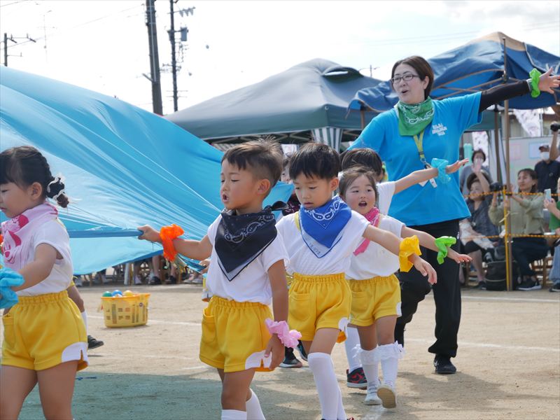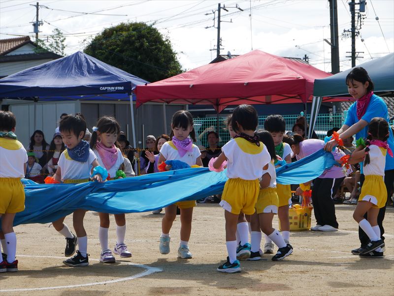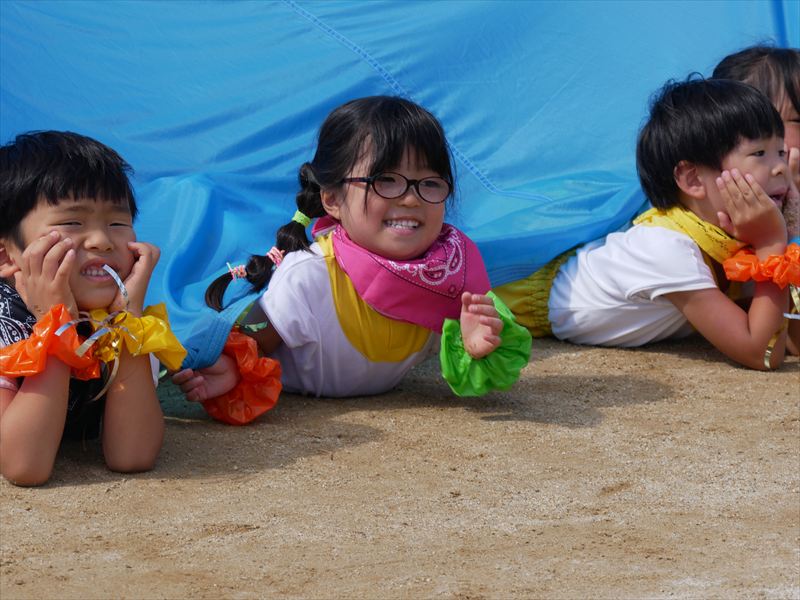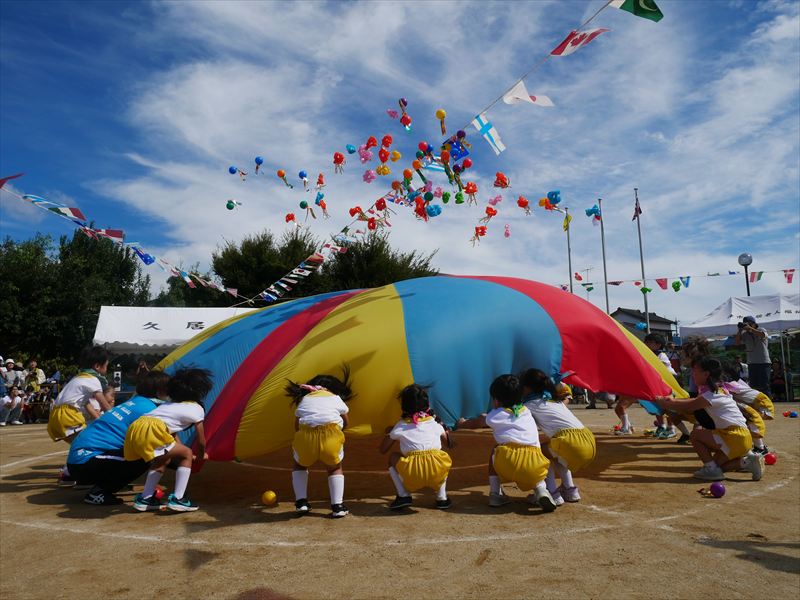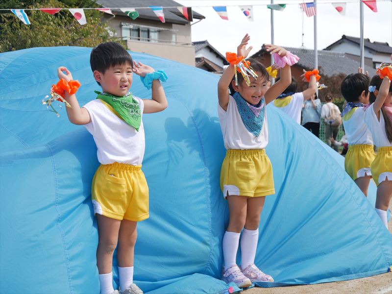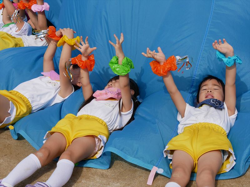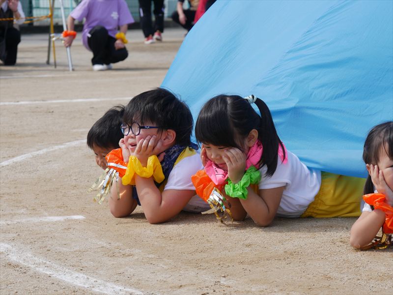 くま組になったら、パラバルーンができるよと楽しみにしていた子ども達は、パラバルーンで遊ぶことが大好きです。一つひとつの技が成功すると、とってもいい笑顔になる子ども達。沢山の技を見せてくれましたね。素晴らしい演技でした。