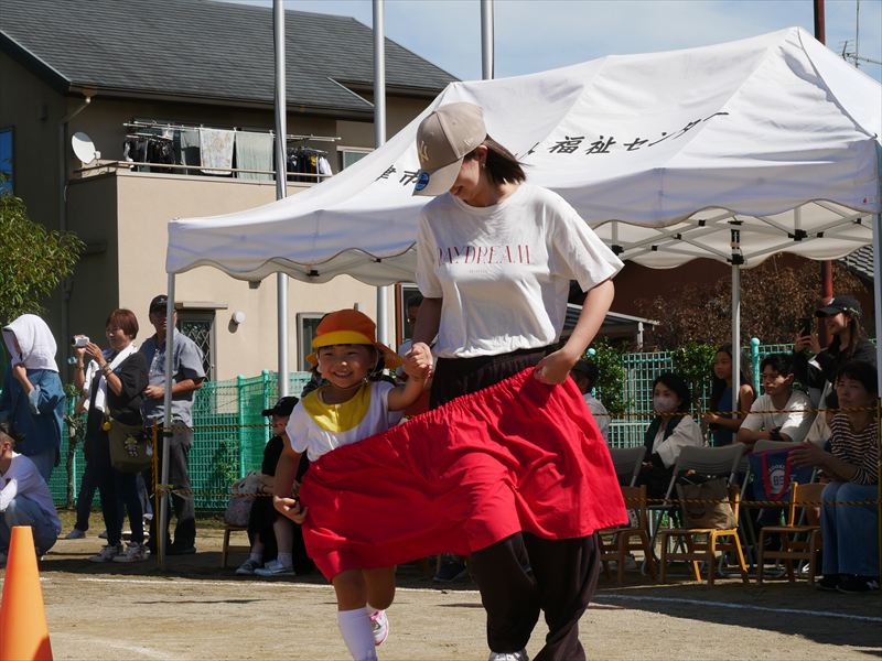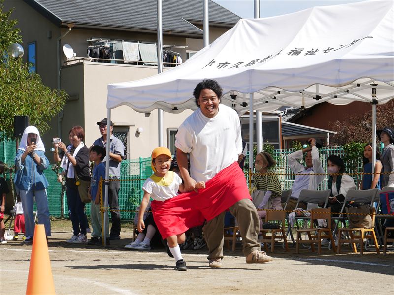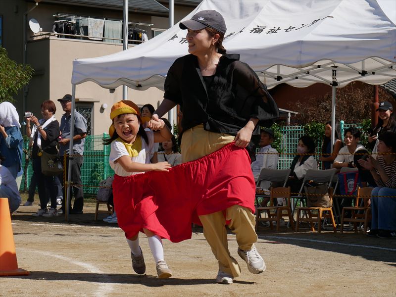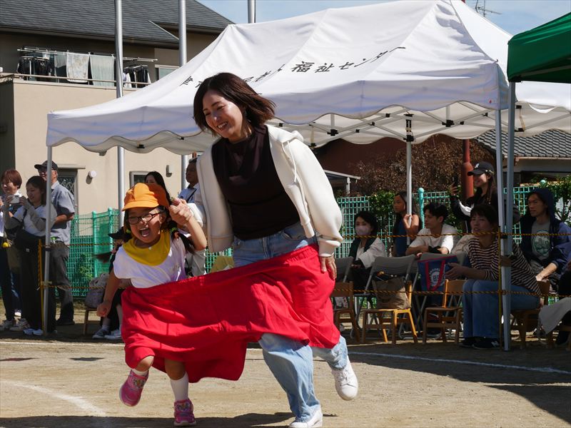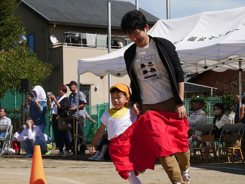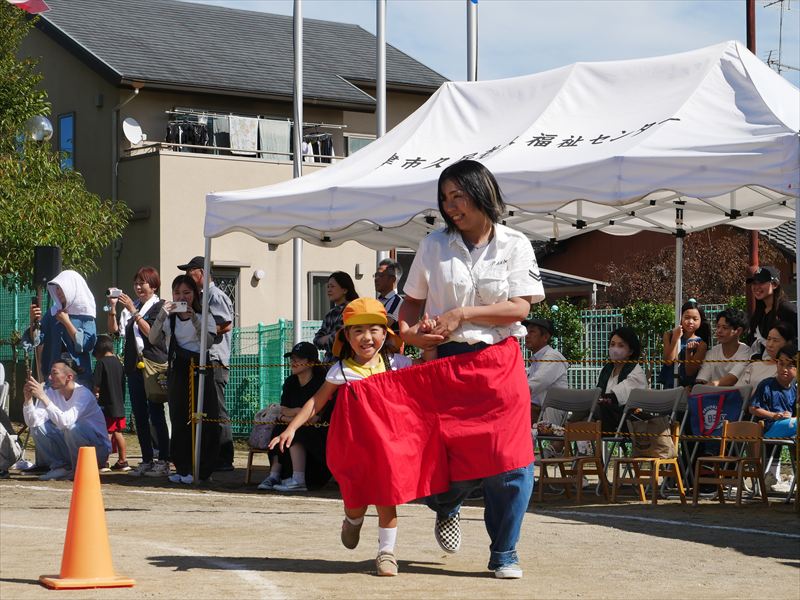 お家の人と二人仲良く大きなパンツ、デカパンをはいて走ります。息を合わせて最後まで走ります。皆さん、息ぴったりでしたね。