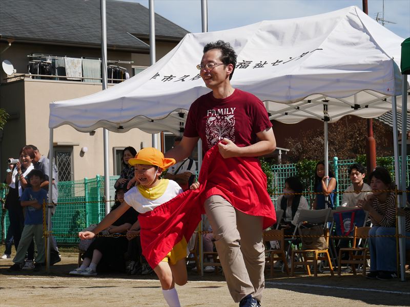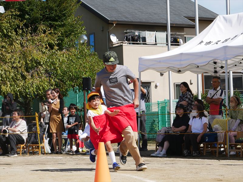 プログラム12番は、4歳児くま組の親子競技「デカパンはいてよーいドン!」です。