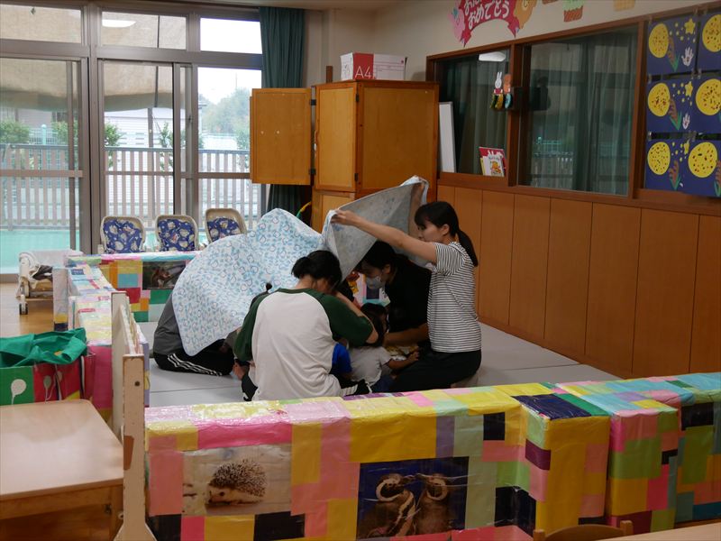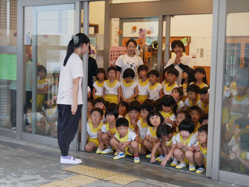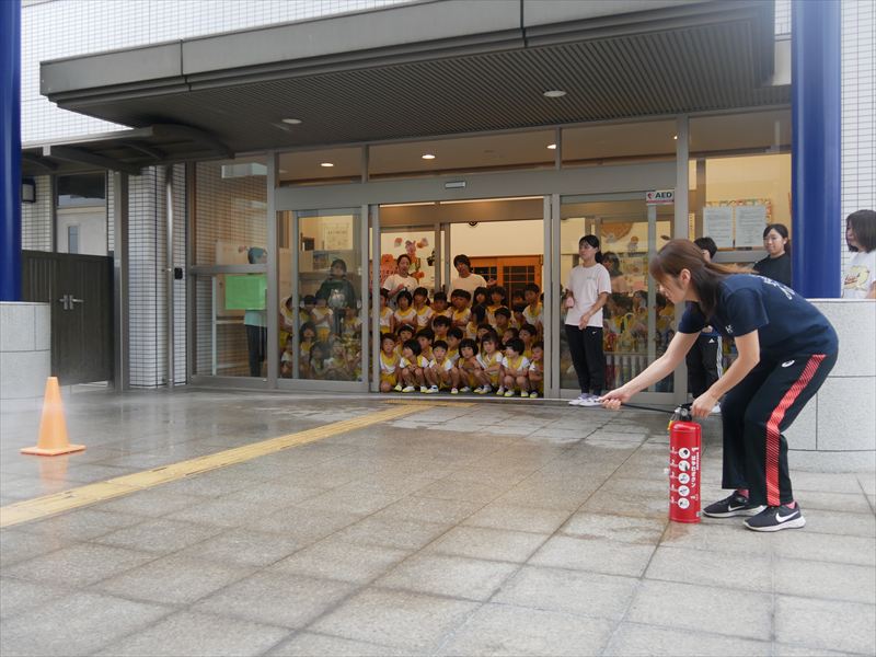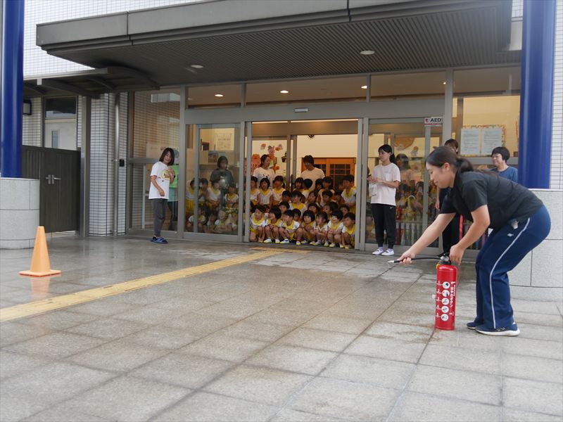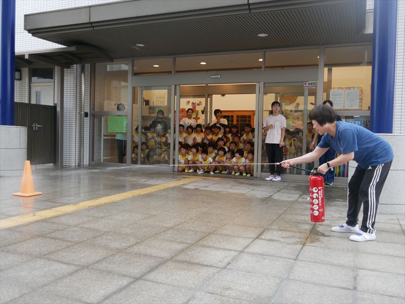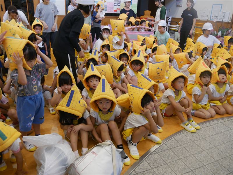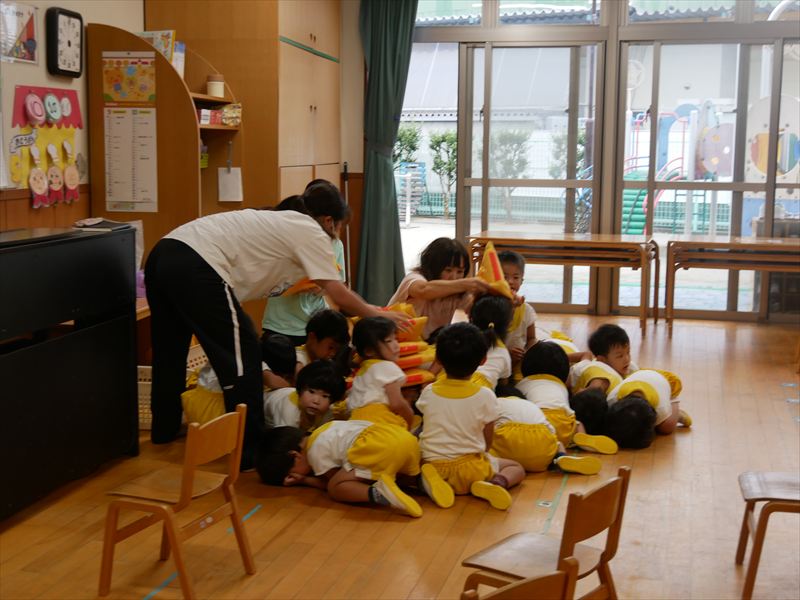 地震と火事を想定した避難訓練を行いました。この日はあいにく雨が降っていたので、玄関ホールに避難しました。毎月練習してきましたので、子どもたちは皆とても上手に避難します。ただ、どこが火事になりどこへ逃げるのかは、毎回違います。放送をよく聞いて、先生の指示に従って子どもたちは行動します。上手ですよ。