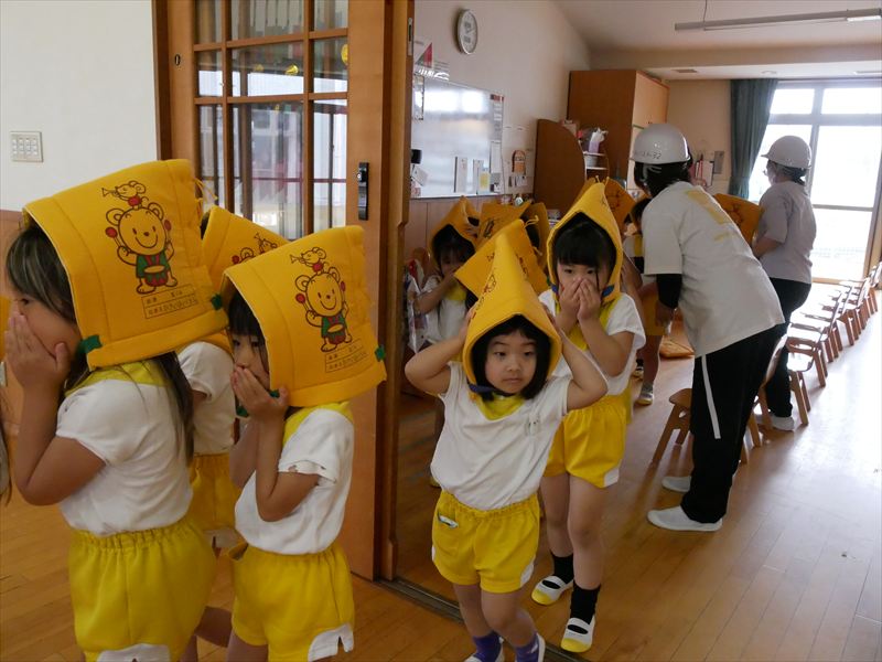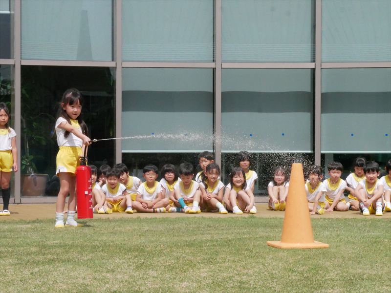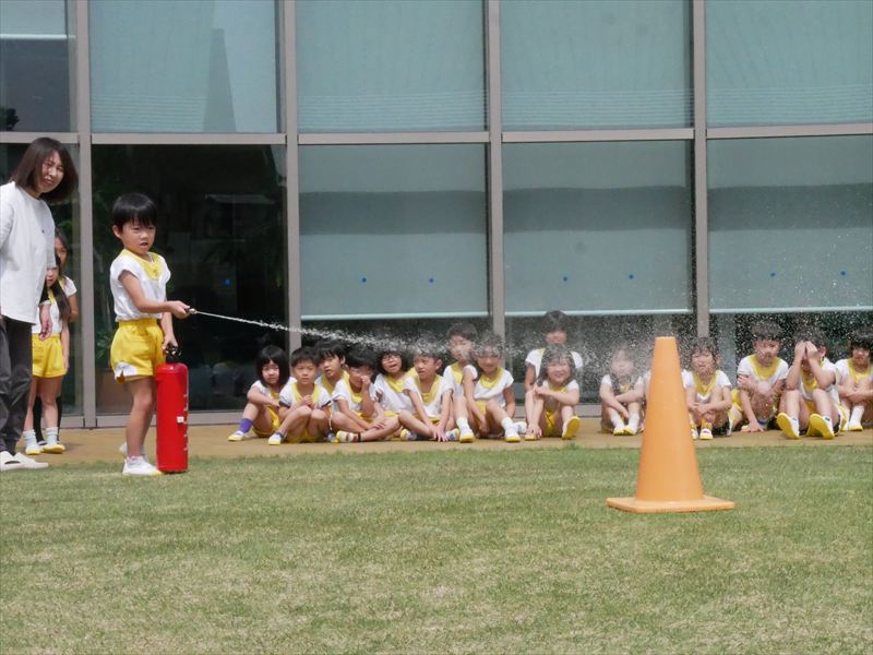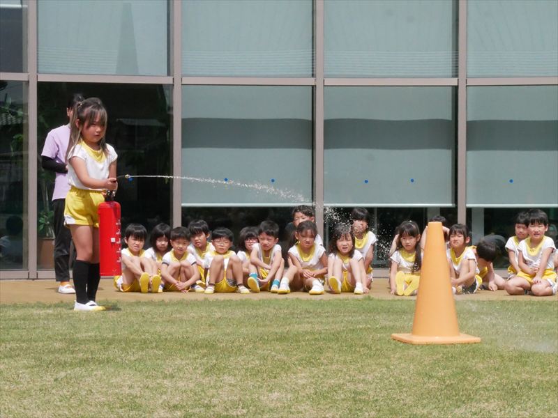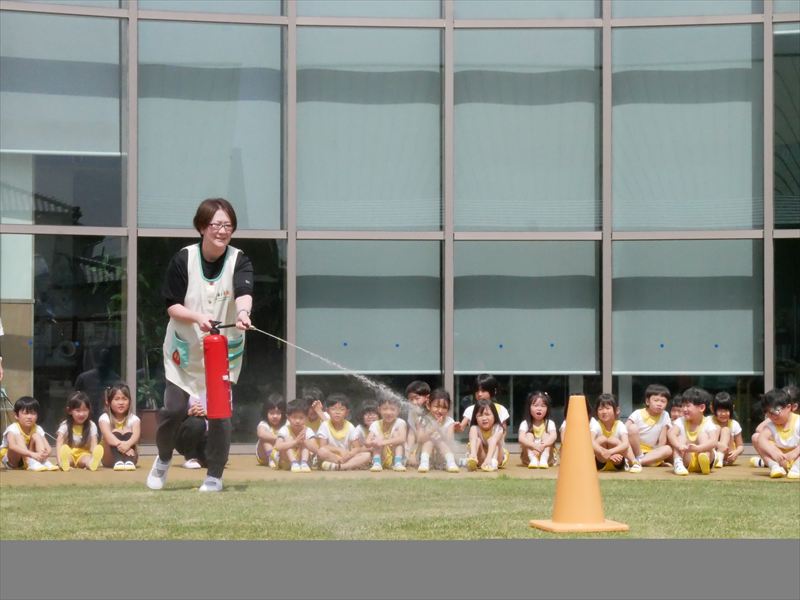 久居保育園は、毎月避難訓練を行っています。火災・地震・不審者等、その時その時の状況を創り出しながら子どもたちと避難の練習を行っています。本園では、年長組の子どもたちにも消火訓練にチャレンジしてもらっています。どの子も「火事です!火事です!119番お願いします!」ととても大声で一生懸命に叫び、消火器を噴射します。なかなかやりますよ!子どもたちも‥‥、もしもの時に備えて。